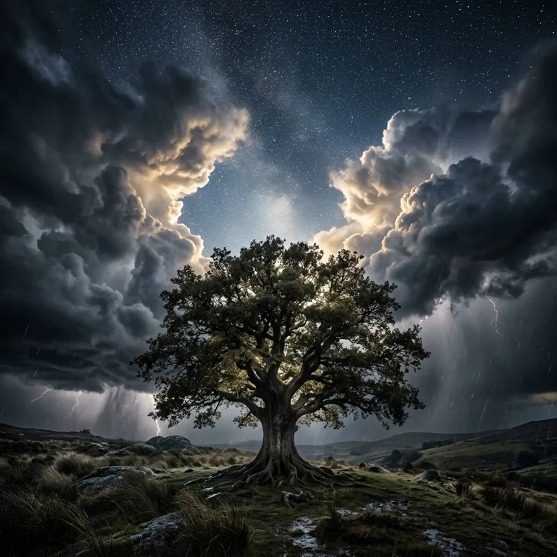 Create a symbolic image that represents resting in divine comfort in spite of adverse situations. Picture a peaceful, serene landscape under a blanket of stars. In the center of the image, a sturdy, majestic oak tree prevails through a harsh storm, representing resilience. The tree is unswayed by the wild tempest, conveying a sense of stability and calm. The silver linings of the stormy clouds provide a symbol of hope that good times are on the horizon. This scene symbolizes reliance on a greater power for comfort, strength, and guidance during difficult times.