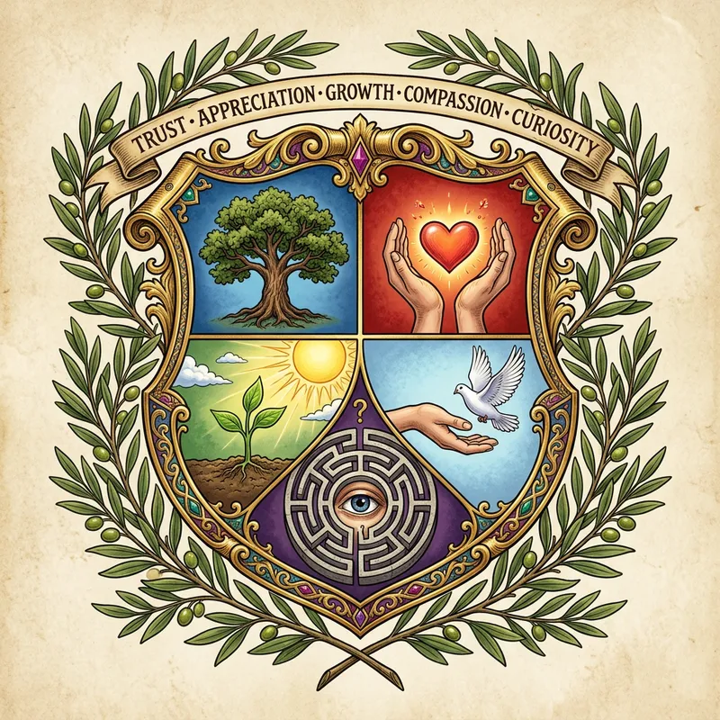 A stylized coat of arms representing the concepts of trust, appreciation, growth, compassion, and curiosity. There should be five quadrants, each pertaining to one of these values. In the first quadrant, symbolizing trust, illustrate a reliable, sturdy oak tree. In the second, for appreciation, show hands gently cupping a glowing heart. In the third quadrant, symbolizing growth, portray a seedling reaching for the sun. In the fourth one representing compassion, depict a caring, open hand extending towards a dove. The last quadrant, signifying curiosity, should have an intricate maze with an eye peering through the entrance. The shield should be encased by branches of olive, symbolizing peace and unity, tying the values together.