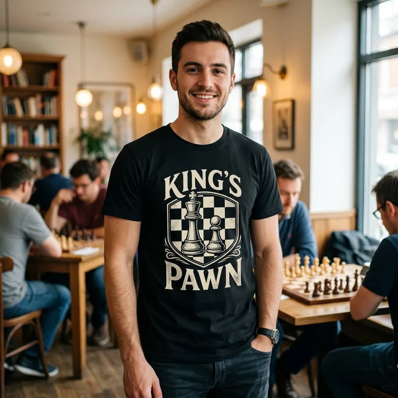 Original Prompt: T shirt with chess design and "King's Pawn" name on it
