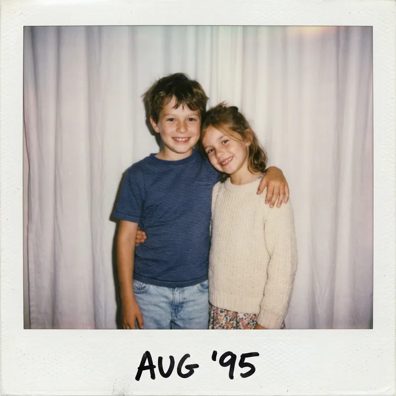 Take a Polaroid-style photograph with a retro, slightly grainy texture. The photo should resemble an ordinary snapshot, not staged or overly polished, with a natural, candid feel. Keep the faces of the boy and the girl exactly the same, without altering facial features. Change the background behind them to simple, soft white curtains that create a clean, airy look. Add a slight blur across the image to mimic the classic Polaroid aesthetic, with a consistent flash-like light source scattered throughout, as if taken in a dimly lit room with the Polaroid flash. The boy and girl should be captured in cute, natural poses together: something warm and playful, evoking closeness and comfort. The lighting should feel soft yet bright, with a cosy glow that enhances the dreamy Polaroid mood.
