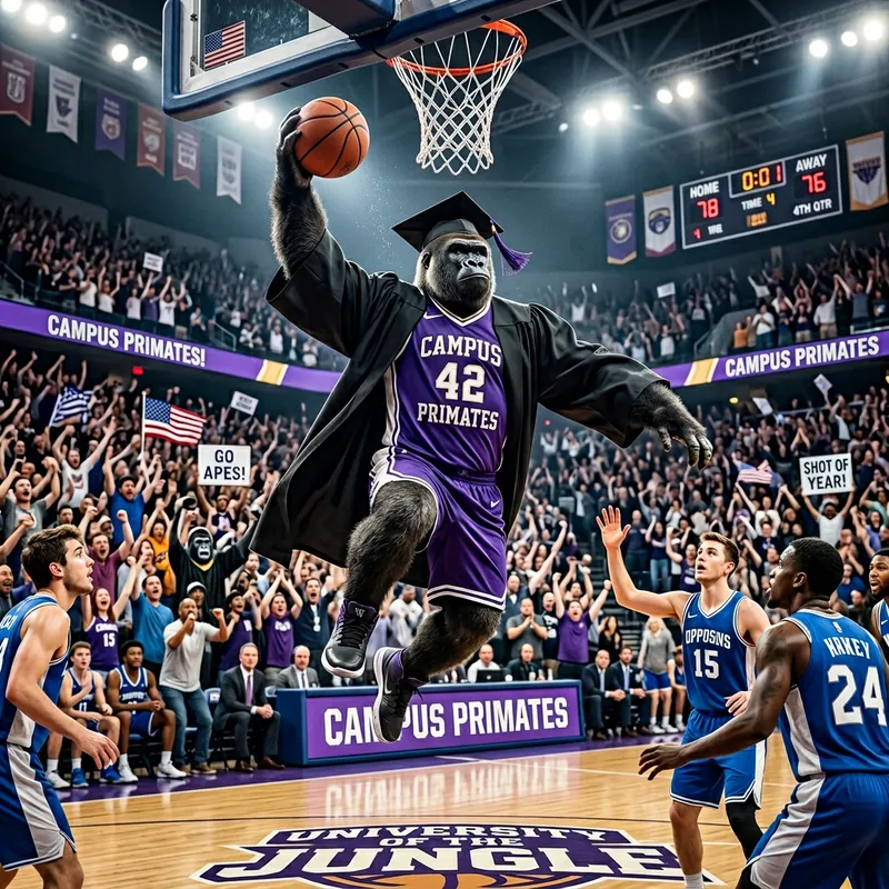 A gorilla, who is also a college graduate, is in the middle of a basketball game. It's a tense moment as it lifts off the ground, balancing the basketball in one hand. Its other hand is reaching out for stability as it prepares to make the stunning shot. Its graduation cap is sitting firmly on its head, a symbol of its educational achievements. The surrounding court is filled with spectators, cheering for the talented gorilla.