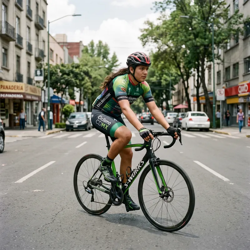 A tall and large Hispanic boy with long hair, wearing a sporty ensemble, is riding a high-end bicycle in the middle of the street.