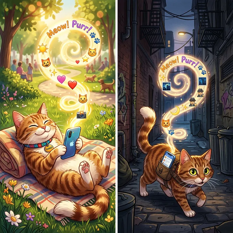 Create an image of Tango, a playful adventurous cat, with his trusty mobile phone. He is seen lounging in a sunlit area of a park, relaxing and enjoying the warmth. In a contrasting scenario, he's seen prowling through shadowy alleyways, his eyes sparkling with the thrill of upcoming adventure. A series of meow and purr emojis spiraling out from his phone, symbolizes him sharing his daily adventures with his online followers.
