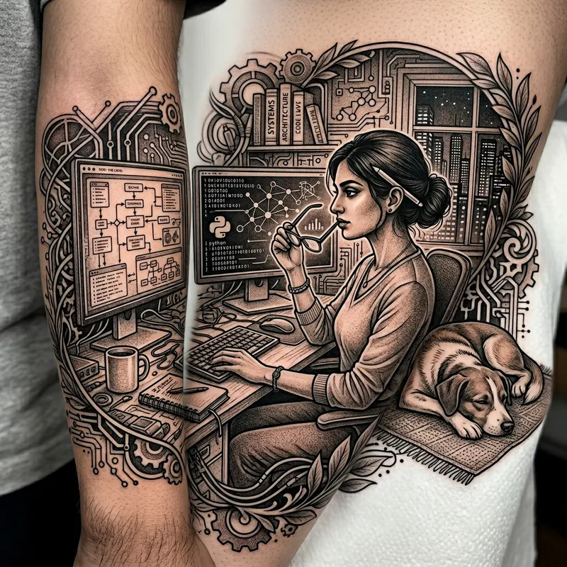 Intricate Tattoo Design: Systems Engineer and Pet Dog