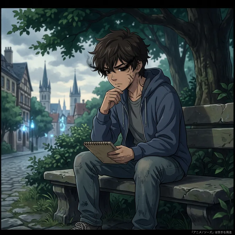 A 17-year old Hispanic boy, normal in appearance but with an incredible strength of character, born on April 21st, making him a Taurus. He loves good food and enjoys company, but also yearns for solitude that often eludes him. His life is often troubled as he is socially outcast, and he contemplates the cruelty of the world. He doesn't have a girlfriend, but he has feelings for a quiet, pleasant and beautiful girl who unfortunately has a boyfriend. This boy, though faced with bitterness and loneliness, doesn't let the tribulations weaken him, but instead, they fuel his determination to become stronger and smarter. This story is set in a magical world where individuals possess magical powers represented by special marks or letters in their eyes ranked as AC, EG, IK, MÑ or BD, FH, JL, NP. The protagonist, however, is not bounded to any element, evidenced by his lack of eye-letter markings but possesses the power to control dark matter. When he unleashes his internal power, his eyes emit a black aura, and unique markings appear on his face and body. Envision this scene as a frame in an anime series.