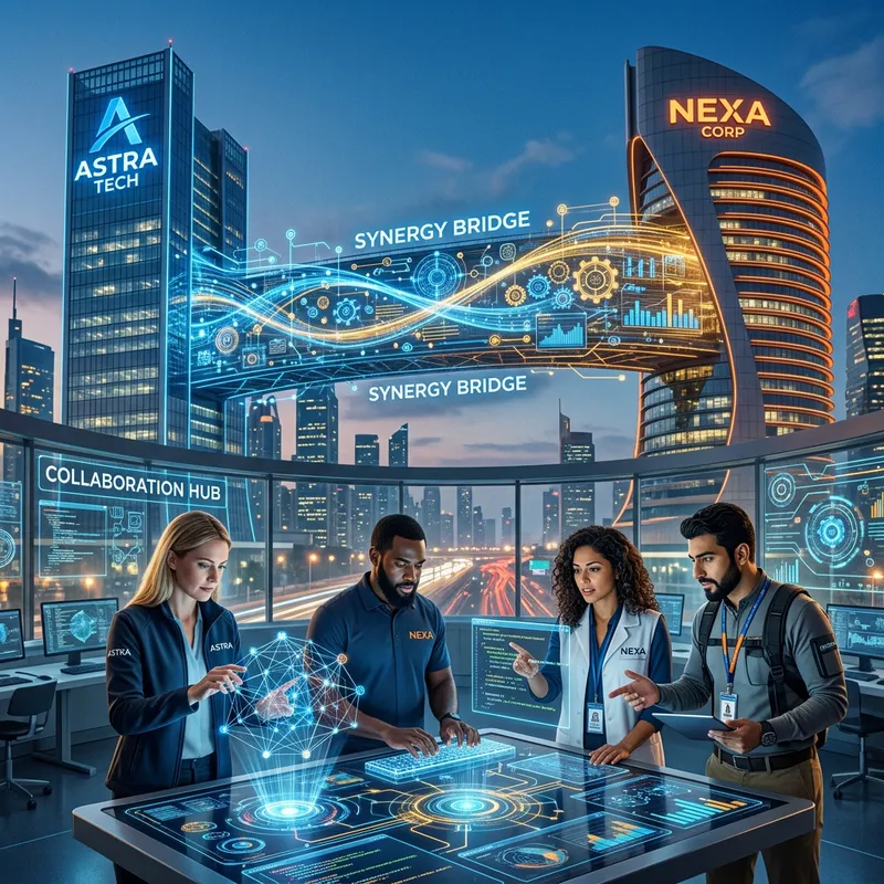 Imagine a visualization of two tech companies collaborating. Picture the headquarters of each company side by side, connected by a bridge symbolic of their collaborative efforts. The bridge itself is an array of moving data streams, digital nodes, and tech gears; a living testament to the union of the two giants. To symbolize the process of their collaboration, depict individuals of various gender and descents - a Caucasian woman, a Black man, a Hispanic woman, and a Middle-Eastern man - working together in a futuristic setting filled with holographic screens and innovative tech devices.