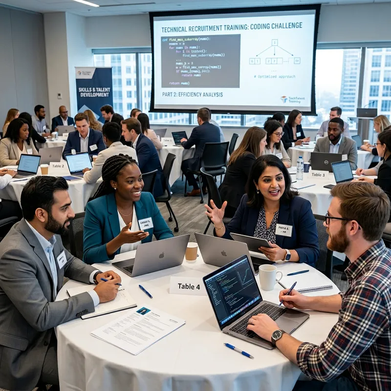 A detailed scene representing a Technical Recruitment Training session. There is a large screen projecting a coding exercise on it, round tables spread across the room, each occupied with team of professionals. A South-Asian female HR professional is engaging with a Caucasian male programmer, discussing a feature in the coding puzzle. On the other table, a Black female engineer is engaged in conversation with a Middle-Eastern male HR professional. They are discussing the engineer's achievements and skills. Around them, there is an atmosphere of collaboration and learning.