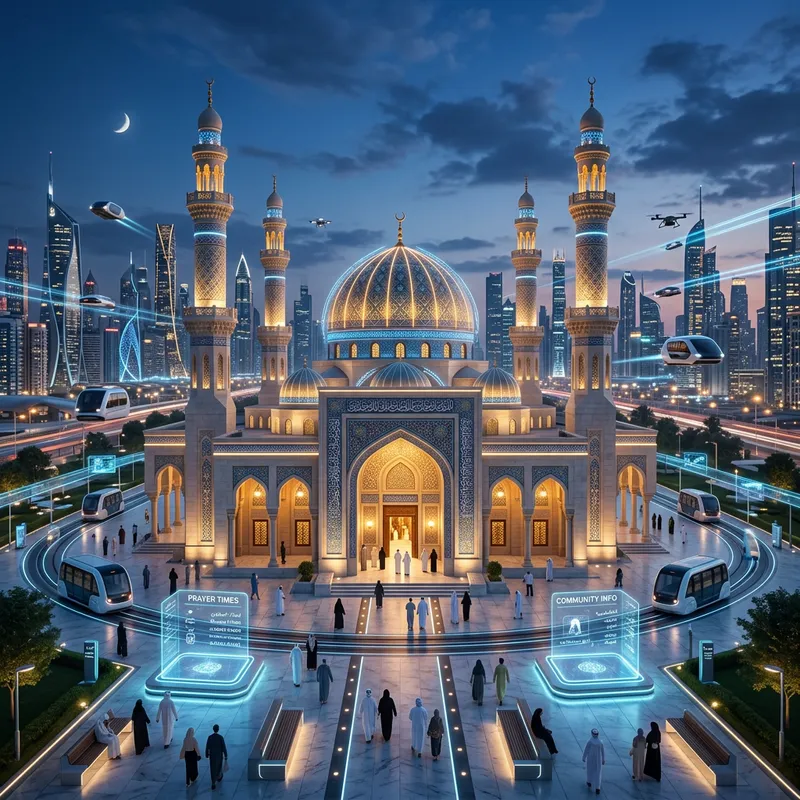 Envision a scene embodying a technological world, where old meets new. The central focus is a mosque, beautifully constructed reflecting traditional Islamic architecture, with iconic features like domes, minarets, and ornamental arches. However, they are intricately interlaced with high-tech elements. Consider floating digital platforms nearby used for information, LED lights accentuating structural details, autonomous transport systems in the vicinity, and architectural components made from smart materials. Amidst a dynamic skyline filled with contrasting elements of classic and advanced structures, the mosque remains a tranquil central piece, providing a serene and contemplative space amidst the bustling, technologically advanced surroundings.