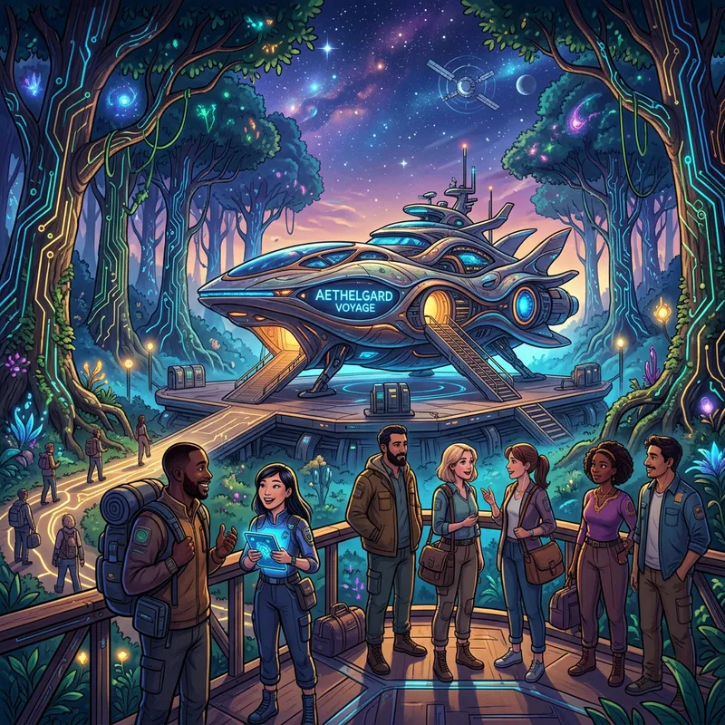 Imagine a lively and pulsating animated scenery exhibiting the ideal blend of the natural sphere and progressive technology. At the heart of this composition, there sits a ship, poised for a technological odyssey. Edging this centerpiece, a mystical forest stretches out, its trees unique, the bark imprinted with circuit-like patterns signifying the entwining of biological and digital life forms. A group of diverse people of different genders and descents, like Black, Asian, Middle-Eastern, and Caucasian, both male and female, are patiently waiting, suggesting anticipation for the voyage that the ship entails. This imagery is intended for an adult audience.