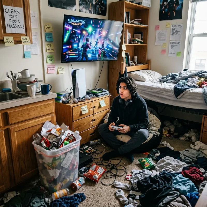 A vivid depiction of a room in disarray. Piles of laundry are scattered on the floor, nearby, a trash can overflows with rubbish. A stack of unwashed dishes is in the sink, and dust bunnies gather under the furniture. At the center, a Middle-Eastern teen male is engrossed in playing a video game on a console which is connected to a large flat-screen TV. The reflection of the game is seen on his wide-eyed, focused expression. Throughout the room, reminders and sticky notes for chores are visible on walls and furniture, ignored in favor of the digital adventure on screen.