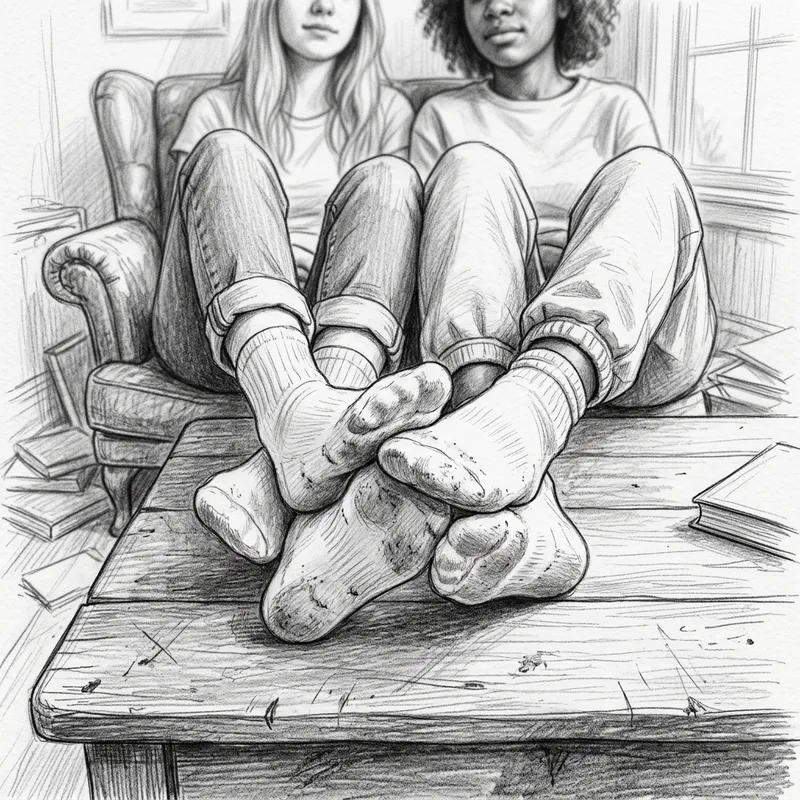 A sketch of two teenage girls pictured in a relaxed pose. One is a Caucasian girl and the other is a Black girl. They are both resting their feet on a weathered, vintage table. The focus of the composition is their worn-out white socks, stained from a day of lively activity. They both have their legs straightened with ankles intertwined in a casual, untroubled style. The image is a homely snapshot of their shared moment, with emphasis on the soles of their dirty white socks.