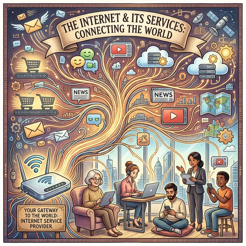 An intricate illustration reflecting the concept of the internet and internet services, with various elements to depict communication. Include symbolic representation of a leading Internet Service Provider, denoted by a prop of a generic modem or router. Also portray a group of five diverse individuals: two Caucasian females, one Middle Eastern male, one South Asian female, and one Black male, all shown to be engaging with various types of devices, such as laptops, smartphones, tablets, thus showcasing the utility and reach of the internet.