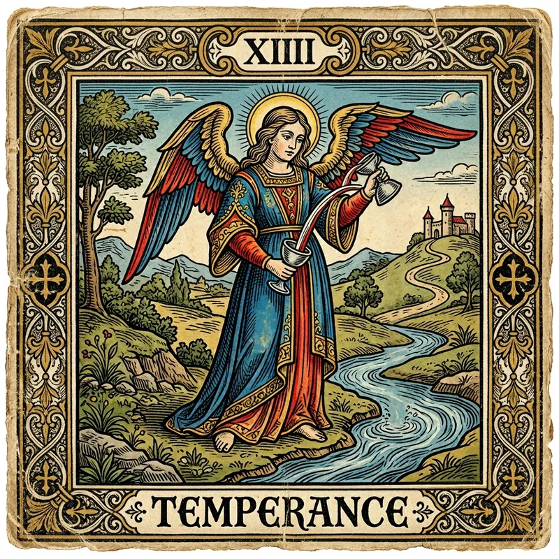 Visualize an ancient Tarot card from the Tarot de Marseille deck, specifically the Temperance card. The card showcases an angel, gender-neutral and race-unspecified, delicately balancing two cups, representing equilibrium and balance. The background setting is an intricate blend of nature with a serene blue sky and a verdant landscape. The angel should have one foot on ground, symbolizing practicality, and another foot in the water, symbolizing intuition and inner voices. The card is bordered by intricate designs in gold and white, bearing traditional symbols based on the Tarot de Marseille design.