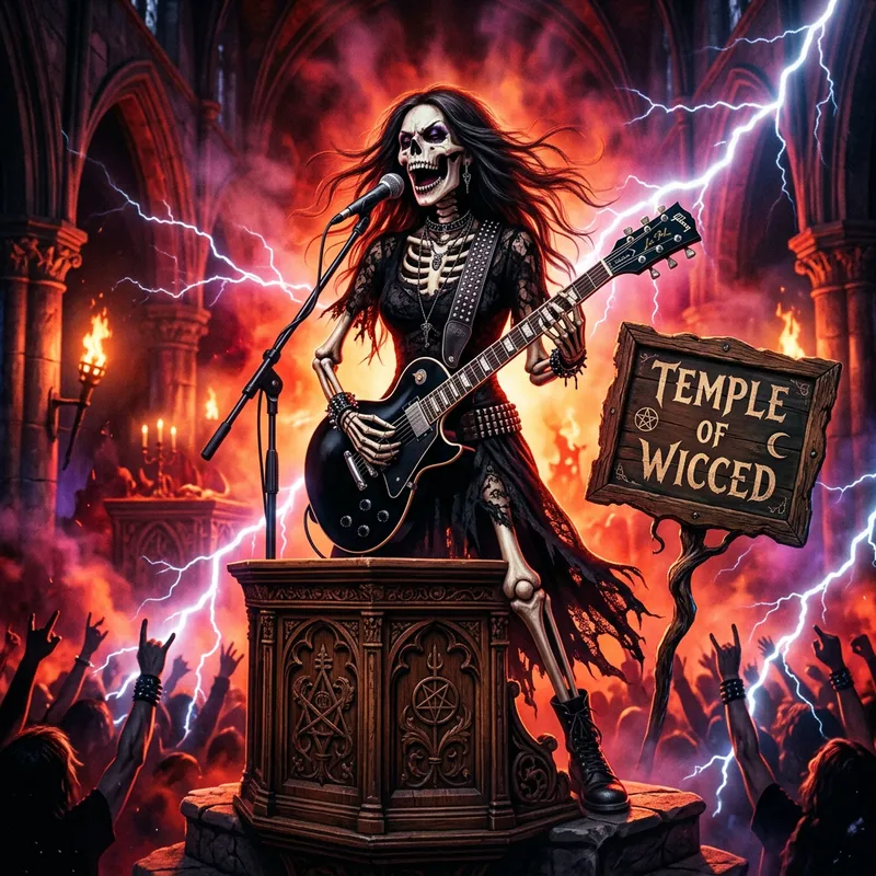 An antique pulpit with a creatively rendered skeletal character possessing feminine traits, skillfully playing a glossy black electric guitar often associated with classic rock bands. The character appears to be passionately singing a song. Next to her, a sign stands floating, bearing the inscription 'Temple of Wicced'. The atmosphere is intense and electrifying, painted in vigorous shades of red, interspersed with crackles of energetic lightning providing sharp contrast.