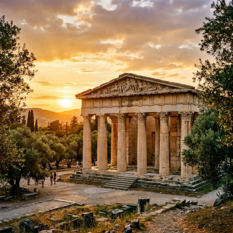 Generate an image of the Temple of Zeus at Olympia. This ancient structure is known for its grand columns supporting a pitched roof, with intricate carvings depicting scenes from mythology. Its elegant design combines the Doric and Corinthian architectural styles. The temple is surrounded by lush olive trees and is bathed under the warm, golden light of a setting sun.