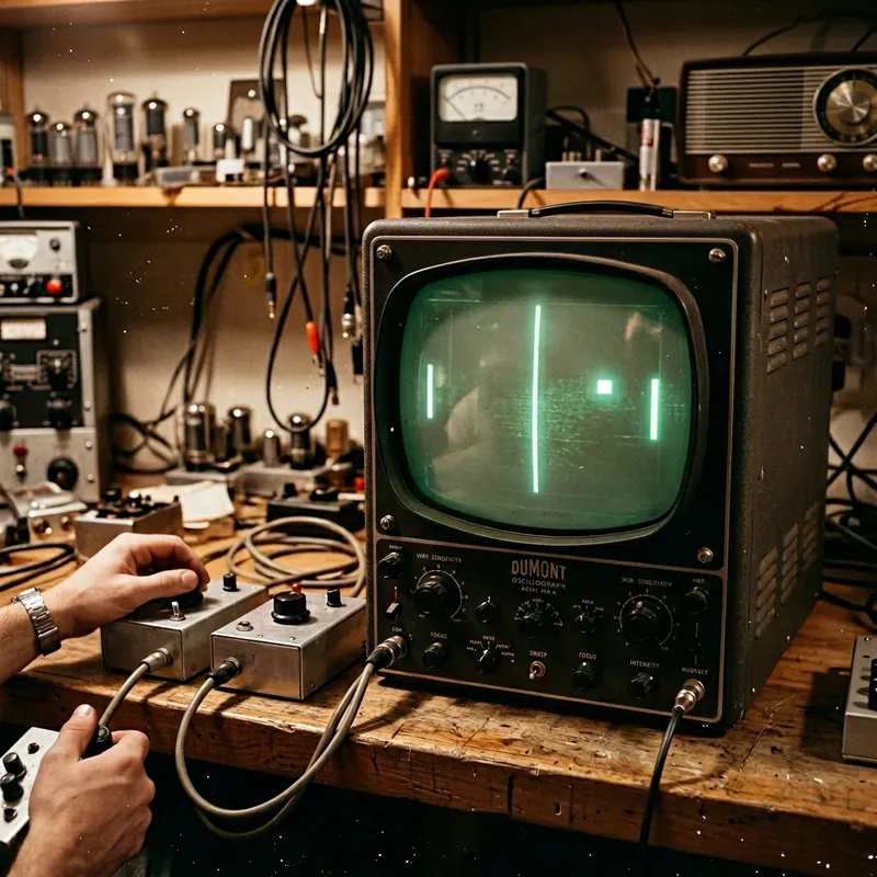 A recreation of the classic 1958 video game 'Tennis for Two'. The game features a simple black and white screen with two paddles on either side depicted as vertical lines, and a small pixelated ball bouncing between them. The background should show some vintage technology, probably an oscilloscope, which was used to display this game originally.