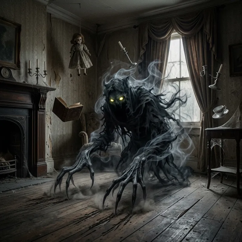 An eerie house demon, manifesting itself with a grotesque appearance. It has glowing yellow eyes peering out from a shadowy form. Ethereal smoke trails around its body, contributing to its spectral quality. Its long, curling claws are intimidating, scraping against the wooden floors of the house it haunts. As a part of its haunting, it makes objects levitate around the room, creating an overall atmosphere of dread and intrigue.