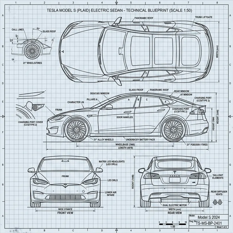Blueprint of a Tesla Model S electric car showcasing multiple angles: the top view showcasing the streamlined roof and sunroof design, side view displaying the sleek door lines and wheel placement, front view highlighting the distinctive grill-less facade and the unique LED headlights, and the back view revealing the prominent rear diffuser and taillight design. Include details such as door handles, tires, windows, and electric charger port.