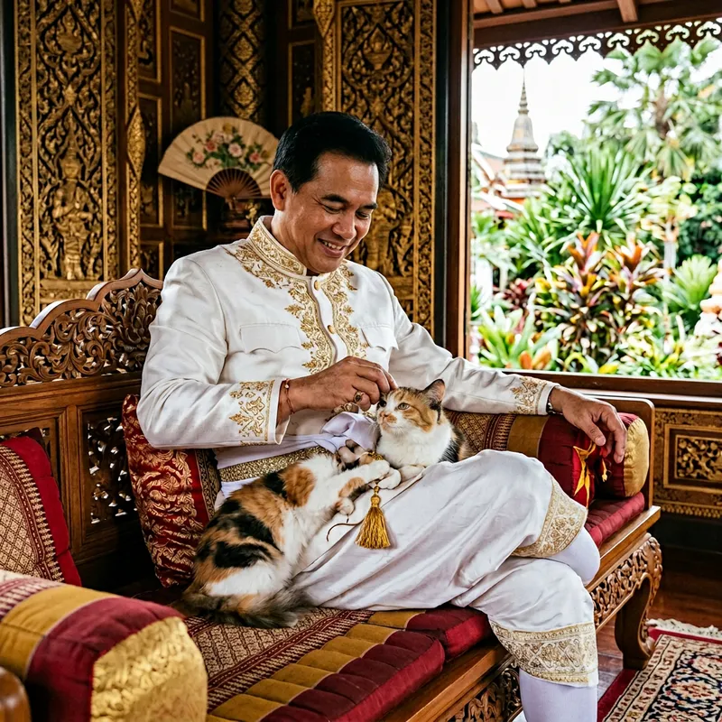 A man dressed in traditional Thai royal attire in white sits in an relaxed position. A cat with soft fur, displaying playful behavior, is nestled comfortably in his lap.