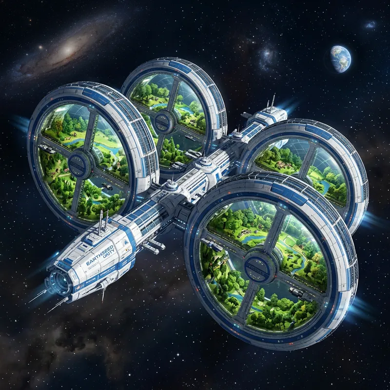 The color of the space ship is white and blue. It is very big. It consists of four circles. In space, there are trees that grow on the ship. The spaceship is a small Earth.