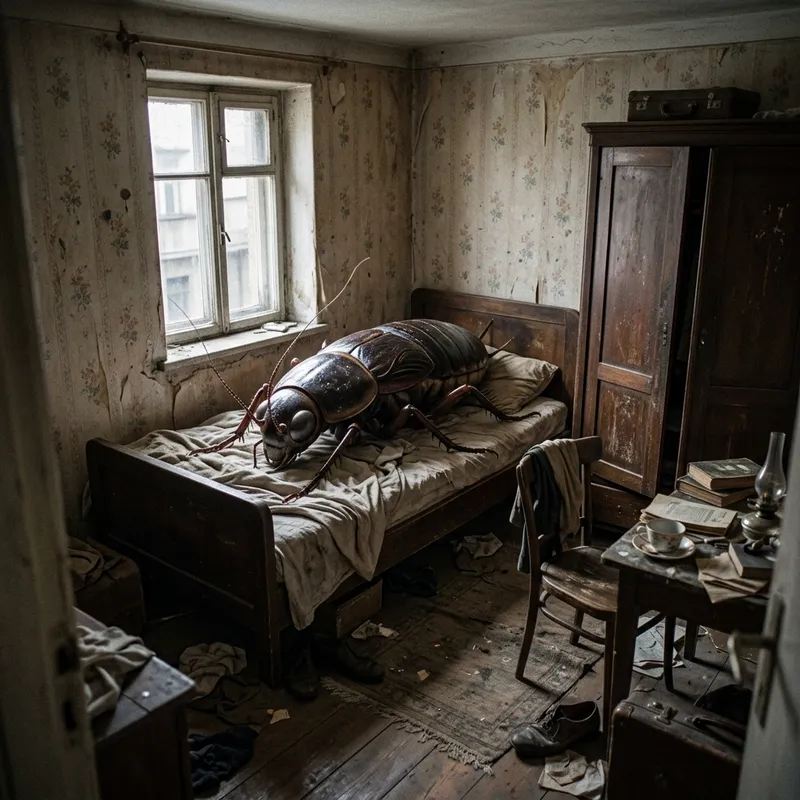 An image inspired by Franz Kafka's 'The Metamorphosis', showing a cramped, messy bedroom with an overgrown insect on the bed. Surrounding the bed are various bits of furniture in a state of disarray, including and old wooden wardrobe, a small table, and a chair. The walls of the room are simple and unadorned, and light shines in through a small window. The dominating presence is the enormous creature, the size of a man, with a glossy, segmented exoskeleton and delicate, twitching antennae, occupying the space where a human should be.