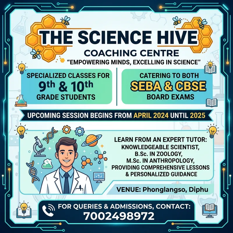 Design a poster for a science coaching centre named 'The Science Hive', offering specialized classes for 9th and 10th-grade students. The courses cater to both SEBA and CBSE board exams, and the upcoming session begins from April 2024 and lasts until 2025. The tutor, a knowledgeable scientist with a B.Sc. in Zoology and an M.Sc. in Anthropology, will provide comprehensive lessons. The sessions will be held at a location in Phonglangso, Diphu. The contact number for queries or additional information is 7002498972.