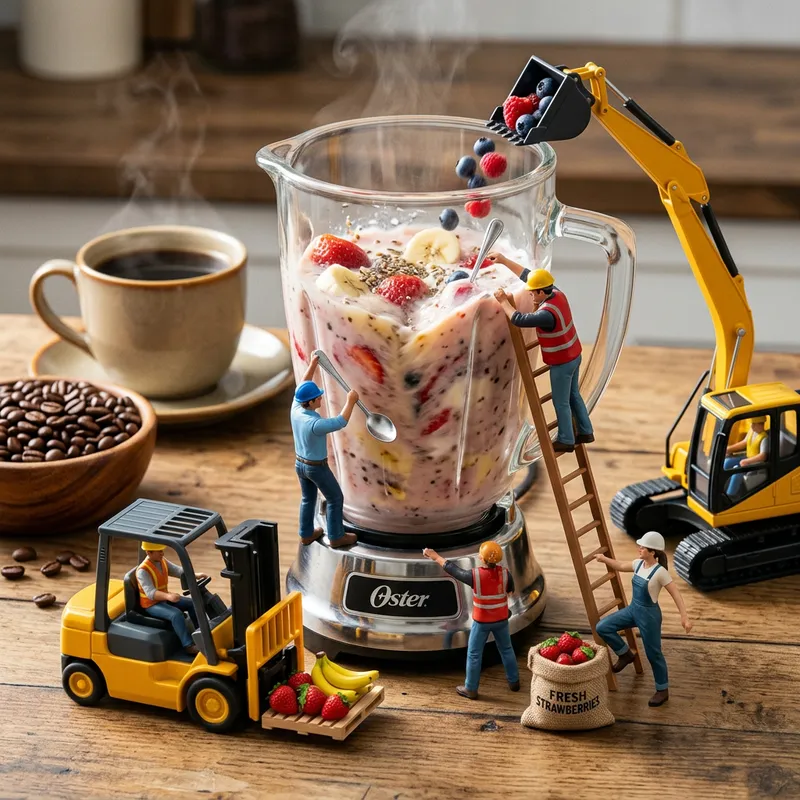 The tiny people drinking smoothie move dynamically around the mixture grinder, carefully placing grinder stirring it. The miniature forklift advances smoothly, pushing. A worker on a ladder leans forward, reaching to place a juice spoon with precise motion. Another worker carefully steps over the strawberry bag, maintaining balance. The excavator’s arm smoothly tilts, Warm lighting accentuates the texture of the cup of coffee and coffee beans, with steam subtly rising. Natural and realistic motion.
