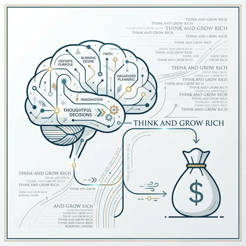 A minimalist representation highlighting key aspects from the book 'Think and Grow Rich'. A focus is on its secret to becoming rich through thoughtful decision-making, symbolized with stylized brainstorming and wealth symbols that stay true to the minimalistic aesthetic. Imagine lines and dots forming a creative brain on one side, and on the other side, a money bag symbolizing wealth, all presented in a sleek and restrained color palette. The title of the book is written all over the image, embedded subtly within its design.