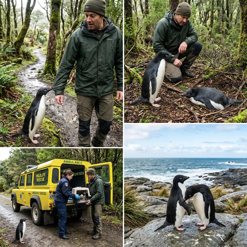 This penguin literally asked a human for help and what happened next will blow your mind. The desperate bird kept pulling at the man's jacket, leading him deeper into the forest where his mate was lying injured and unable to move. Without hesitation, the man called emergency services. The ambulance arrived and carefully transported the female penguin to safety. Days later, both penguins were spotted together, completely healthy and thriving in their natural habitat, proving that sometimes the most unlikely friendships save lives.