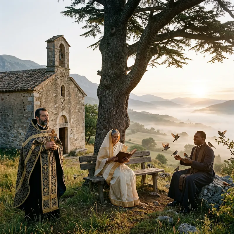 A serene scene depicting three priests. A Middle-Eastern male priest in ceremonial attire, standing in front of an old stone church; a South Asian female priest, hallmark of grace, reading a religious text under the shelter of a cedar tree; and a Black male priest, basking in the soothing sunlight as he converses with a small flock of birds. The backdrop features a vast, beautiful landscape dappled with patches of low-lying mist during a tranquil dawn.