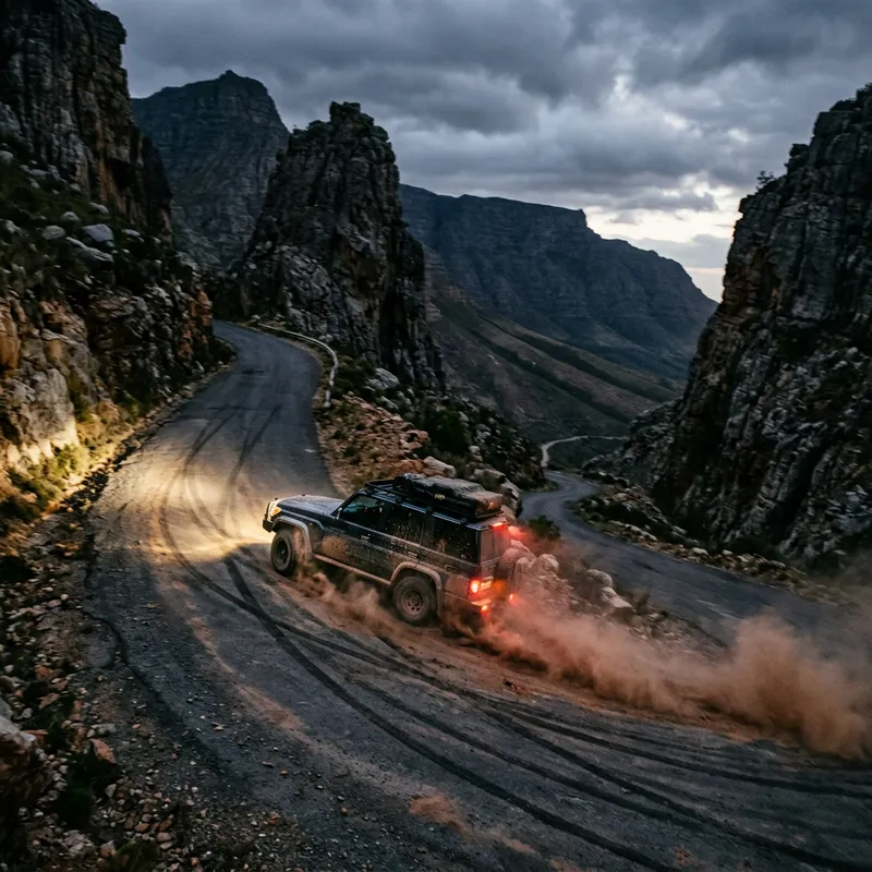 A car descending from a high elevation, with its headlights illuminating the downward sloping asphalt road. Clouds of dust encircle the vehicle as the tires screech and tread harshly against the rocky terrain. Skid marks shadow the car's trail, conveying a sense of urgency. On both sides of the road, rugged cliffs loom ominously, adding an element of danger and adventure to the scene. The sky overhead is clouded, suggesting an early evening setting with the fading light casting long, slanting shadows that add depth to the overall composition.