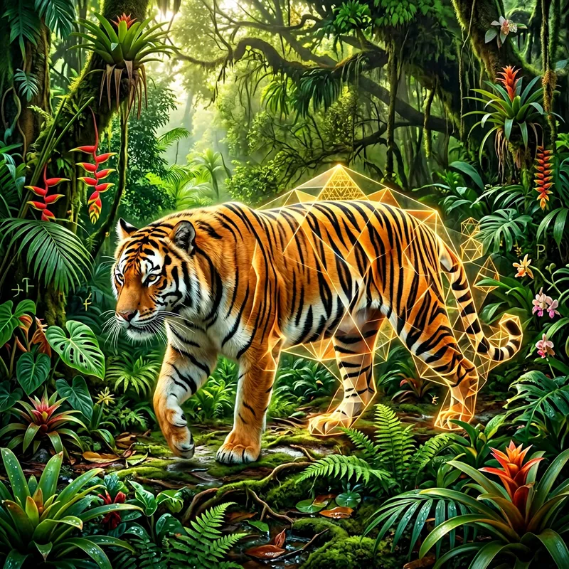 Tiger Morphing Into Geometric Shape in a Lush Tropical Jungle