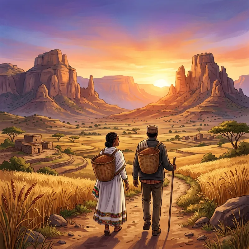 Illustration of a typical landscape in the Tigray region of Ethiopia during sunrise. The region is characterized by its rugged mountains and expansive plains. In the foreground, an Ethiopian woman wearing a traditional dress and an Ethiopian man in casual attire are walking alongside each other, carrying baskets filled with teff grain, one of the region's staple crops. The morning sun is rising, casting a warm golden glow over the scene, and the sky is transitioning from hues of purple and blue to lighter shades of orange and yellow.