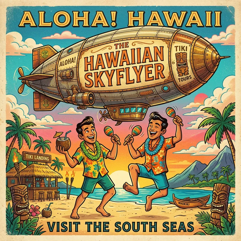Conceptualize an illustration that presents lively and joyful twin characters inspired by Tiki culture. They should be depicted with vibrant and tropical hues lending themselves effectively to a vintage travel poster aesthetic. The tropes of this vintage flair should show in their clothing, facial features, and overall styling. Have the twins striking dynamic poses against the backdrop of a large blimp, which is a mainstay of retro-futuristic themes. Note that a wide-angle perspective should be used to ensure the entirety of the blimp is displayed, infusing a sense of grandeur and vastness. The composition should achieve a synergic mix of tropic Tiki ambiance along with the flair of anachronistic retro futurism.