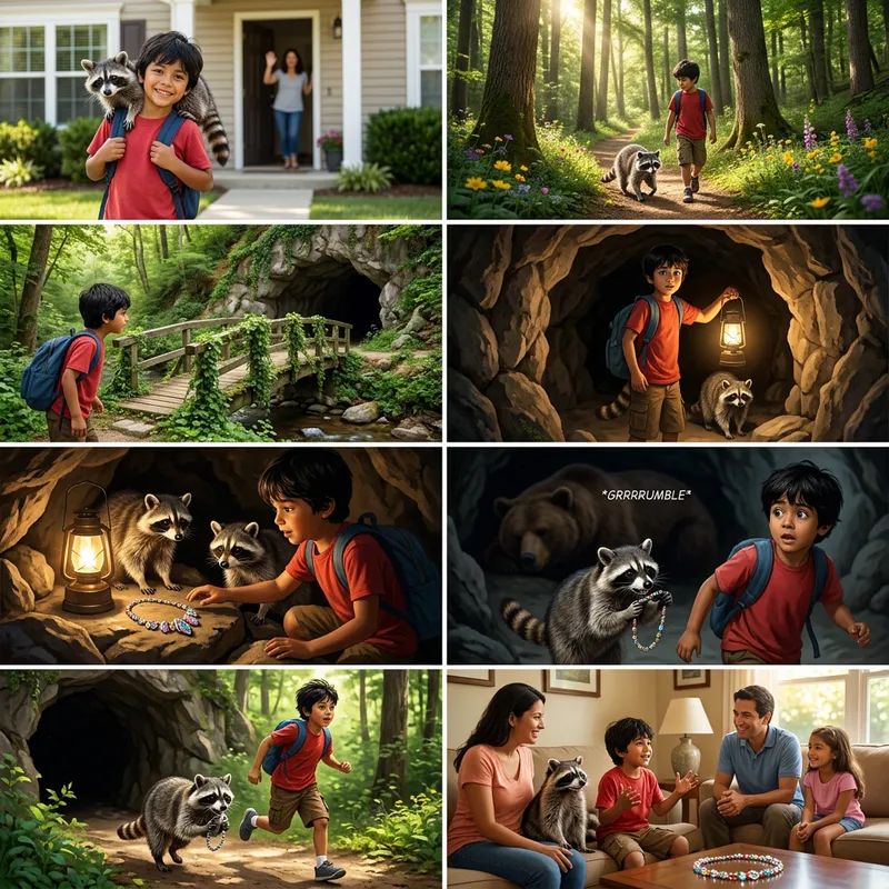 In a beautiful sunny day, a bright-eyed, black-haired little boy named Tim, of Hispanic descent, steps out of his home with his backpack and his faithful companion, an intimate, agile raccoon aptly named Rocky. Tim, wearing a red t-shirt and brown shorts, and Rocky amble along a trail in the forest, filled with tall, stately trees and brilliantly colored flowers. Suddenly, they find a vine-covered bridge leading to a mysterious cave. Intrigued, they decide to explore the cave together. With a sturdy lantern clutched in his hand, Tim and Rocky step into the enfolding darkness. Inside this cavernous domain, they discover a resplendent treasure hidden amidst the rocks: a stunning necklace with sparkling crystals. Just as they're about to pick it up, they hear a grumbling growl echoing from the deeper darkness - it's a massive, woolly sleeping bear! As quick as a flash, Tim and Rocky dash towards the cave's entrance, narrowly escaping the bear. Finally, back under the sun's warmth, they are, with the glittering necklace in hand. They return home, their hearts pulsating with the day's adventures and the found treasure safely tucked in the backpack. Back home, Tim and Rocky regale their family about the cave's thrilling adventure. They feel elated and proud about their shared bravery and friendship, their enthusiasm bubbling as they prepare for their next adventure together.