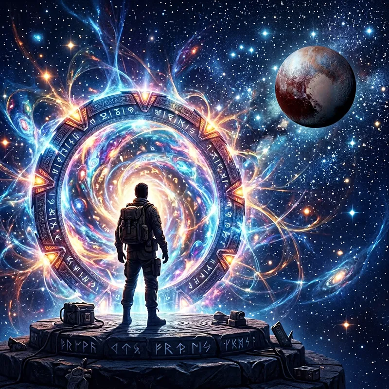 Imagine a depiction of time travel with an individual standing in front of a brightly glowing stargate that's swirling with radiant colors. Radiating energy surrounds the stargate, symbolizing a multiverse, and each universe within the multiverse contains different realities. Floating inconspicuously within this cosmic display is a detailed illustration of the dwarf planet, Pluto, nestled comfortably within the constellation of Aquarius. Stars twinkle in the deep blues of Aquarius and reflect off Pluto's icy surface, creating a mesmerizing and ethereal scene.