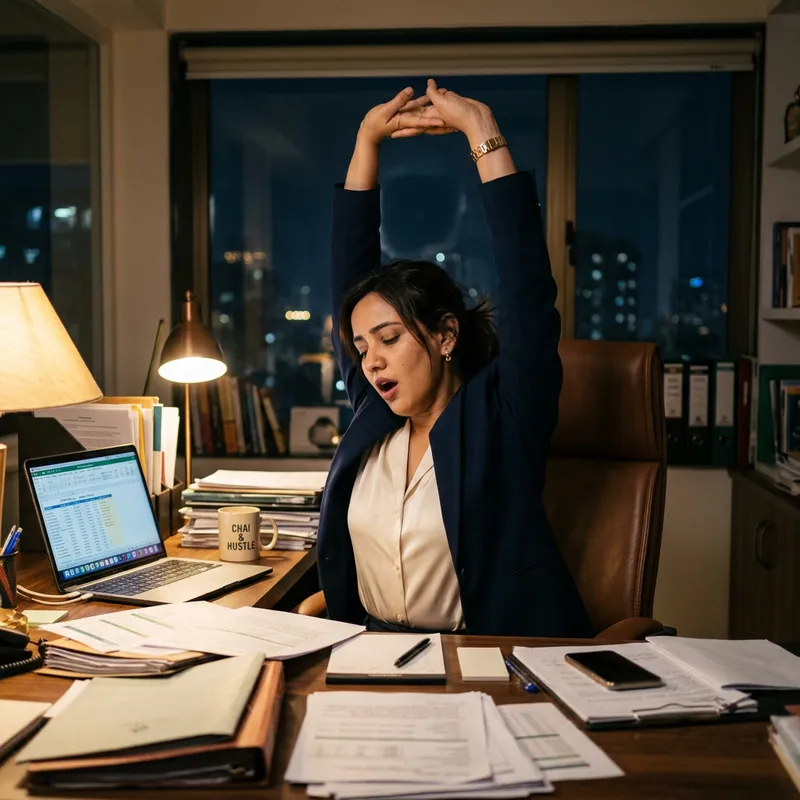 A South Asian businesswoman in her sophisticated suit, sits in her well-lit office late at night. She's exhausted from a long day of work, her eyes are showing signs of tiredness. Her office reflects a hardworking day, with documents spread across her desk and a laptop open with several tabs. She's leaning back in her office chair, stretching her arms up high, yawning slightly. A dimly lit desk lamp casts soft light on her workspace, highlighting the faint lines of stress on her face. Despite the fatigue, traces of determination can be seen in her facial expression, an embodiment of her relentless spirit.