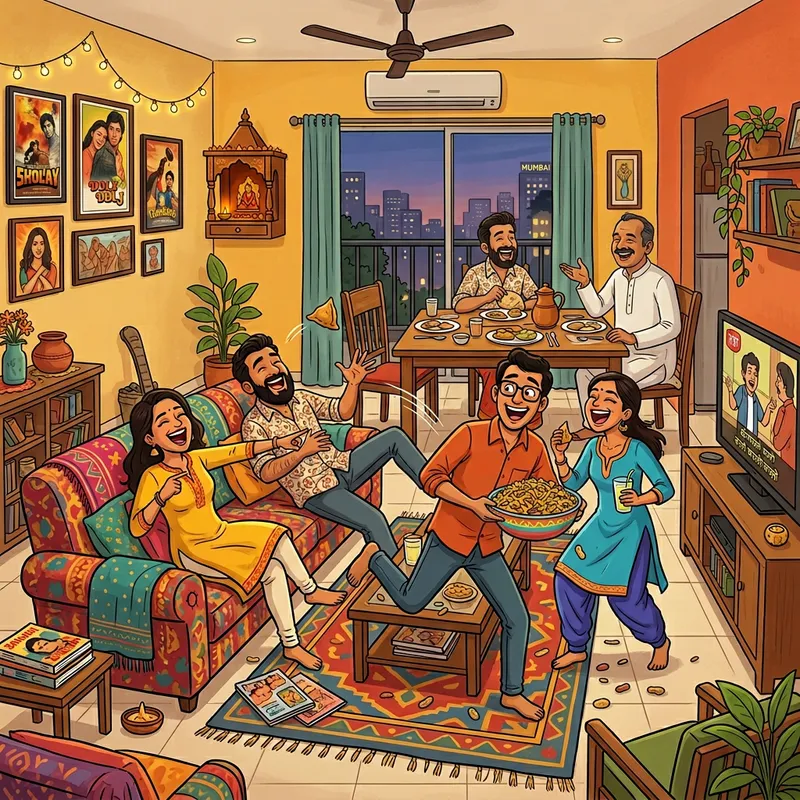 Joyful Indian Sitcom Characters in Urban Apartment Setting