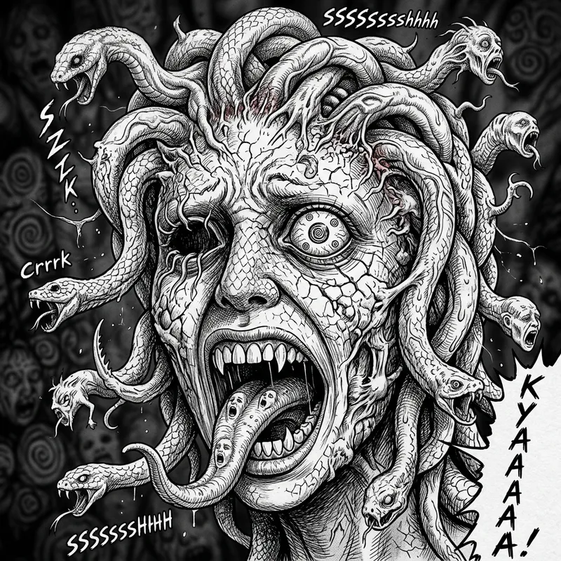 Considering how it looks in its original myth, create an illustration of its face in the style of Junji Ito, innovating its physical appearance but retaining distinguishing elements, exhibiting physical horror.