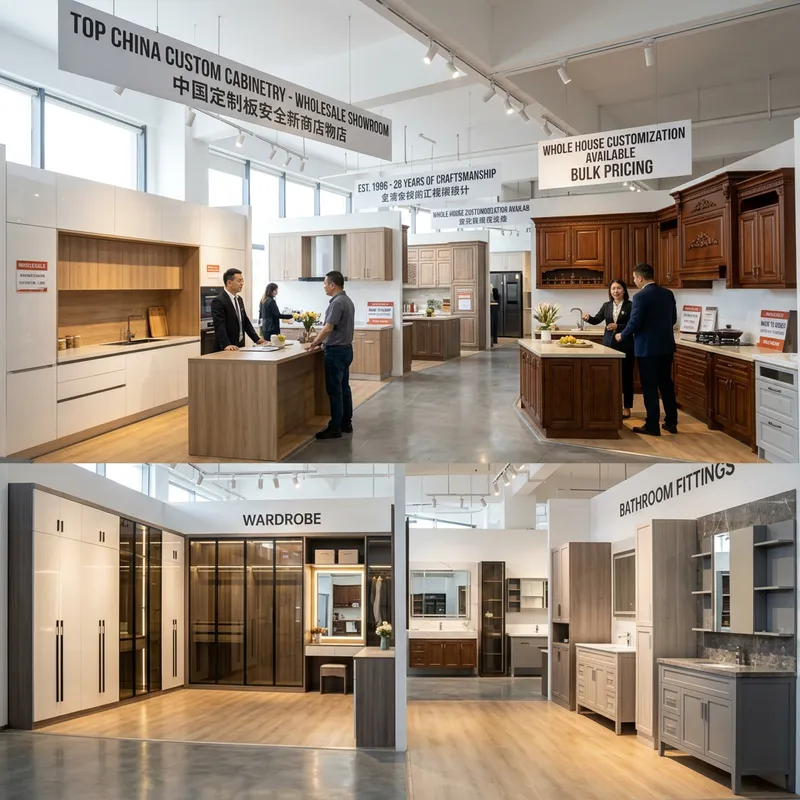 Generate an image depicting the showroom of a top custom cabinet making company from China, with 28 years of history. The room is filled with a variety of custom kitchen cabinets, wardrobes, and bathroom fittings, all available for wholesale. The space exudes an atmosphere of high quality craftsmanship combined with the ability for whole house customization.