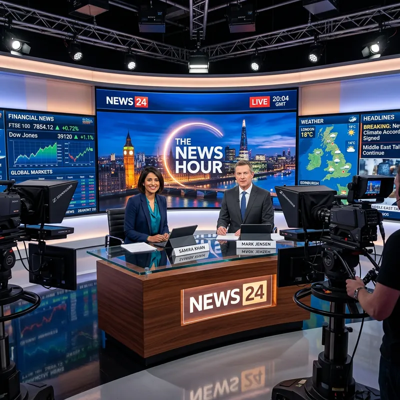 A detailed studio setup for a news broadcast. The room is filled with state-of-the-art technology; large screens displaying stock market numbers, weather maps and headlines. The area is brightly lit, creating a professional atmosphere. In the center, a news desk made from dark wood sits, accommodating enough space for a South Asian female and a Caucasian male news anchor, both dressed in formal attire with news scripts and microphones. Behind them, a large digital cityscape highlights the vibrancy of the hour.