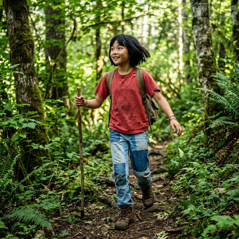 A detailed depiction of a young girl with Asian descent, around the age of twelve. She is outside in a lush forest, her short hair is black and neatly cut. She has a curious expression dabbling with a touch of excitement, her eyes are wide and are full of wonder. Her clothes are a bit ragged and torn — a clear sign of an adventurous spirit. Her pants are mismatched patches of different shades of blue denim, and her shirt is a faded red with a few noticeable holes. She appears to be energetic, her stance ready for action.