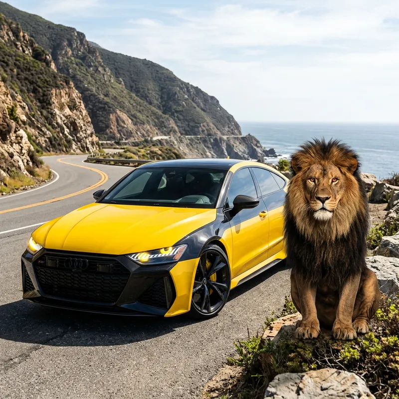 A sleek, modern sedan in black and yellow colors, with the yellow color taking up approximately 70% of the car. The car's front headlights are lit and designed in rounded shapes, reminiscent of the intense gaze of a lion. The colors on the car are vibrant and eye-catching, they pop brilliantly in the sunlight. Sitting regally close to the car is a powerful, majestic male lion, his mane full and impressive. His challenging stare mirrors the lit headlights of the car, creating a powerful connection between the beast of the wild and the beast of the road.