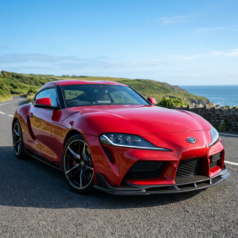A finely detailed closeup image of a Toyota Supra, a high-performance sports car. It exhibits sleek design lines, with its bright red glossy paint reflecting the sunshine. The car's aggressive front end showcases a unique spoiler and aerodynamic curves. The headlamps are crystal clear, featuring modern LED technology. The muscular stance of the vehicle is accentuated by its alloy wheels, fitted with high-performance tyres. It's parked on a smooth asphalt road, against a backdrop of a clear blue sky.
