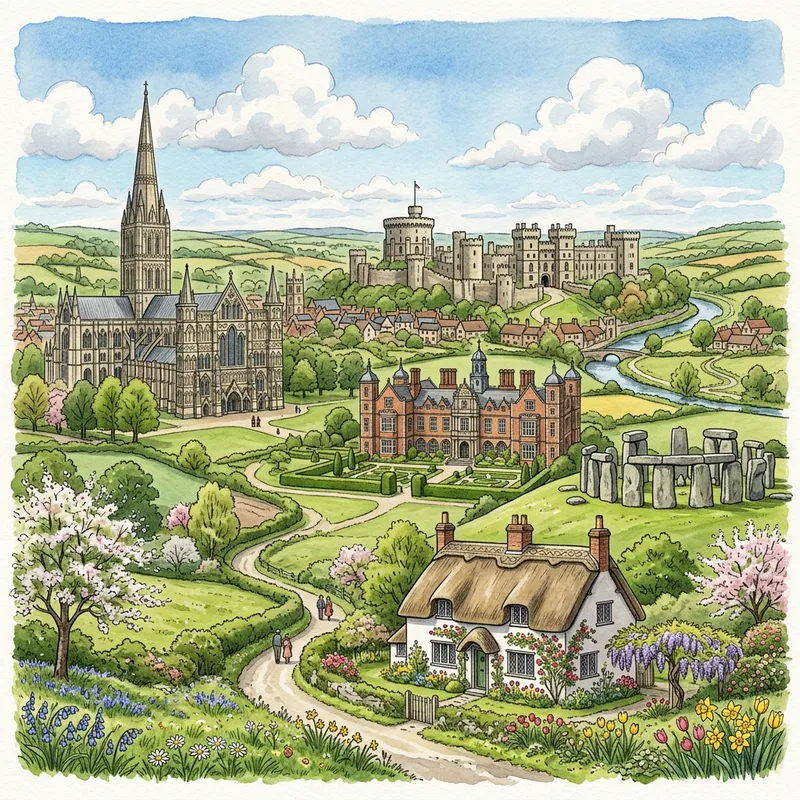 Artistic interpretation of the top five traditional British landmarks, portrayed in classic English architecture style. These landmarks include a grand gothic cathedral, a towering majestic castle, an elaborate jacobean manor house, a quaint thatched countryside cottage, and an archaic stone circle monument. The scene is set during a mild spring day with puffy cumulus clouds floating in the cerulean sky above the landmarks, reflecting the typical English atmosphere.