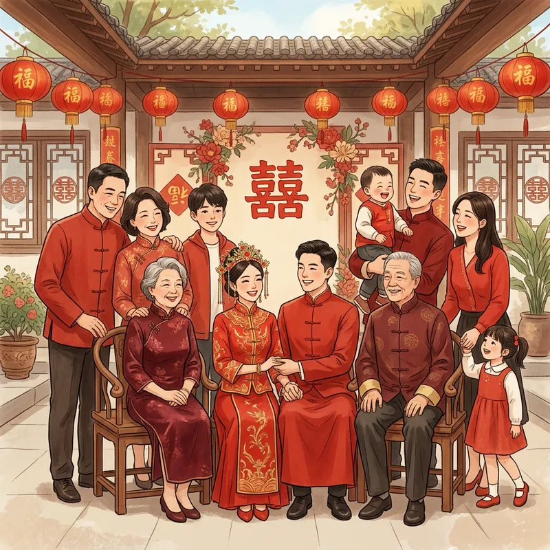 An illustration of a traditional Chinese-style family, with diverse gender representation across multiple generations, authentically celebrating parenthood. They are immersed in joy as they create cherished memories together on an important family occasion, the start of a new marital bond. The scene includes the close-knit family posing for heartwarming wedding portraits that encapsulate their love, joy, and unity.