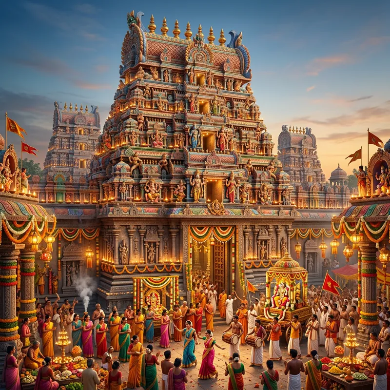 Create a 3D model of a traditional Indian festival temple, richly embellished with sculptural decorations. The temple exterior exhibits intricate architectural designs typical of Indian culture, covered with figures of deities and mythological creatures. There are multiple tiered roofs, each tier adorned with beautifully carved patterns. In the forefront, there is a congregation space for the festival, with lanterns hung around, spreading a warm glow. This space is further accentuated by strings of flowers and colorful fabrics. The atmosphere depicts a lively celebration, showcasing an important part of Indian tradition and community spirit.