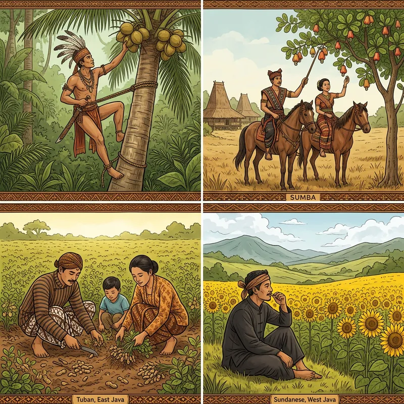 Illustration of a Dayak warrior, dressed in traditional attire, skillfully climbing a coconut tree to gather the ripe coconuts. In another scene, a married couple, originally from the Sumba island in Indonesia, are elegantly dressed in traditional Sumba clothing. They ride strong horses and deftly collect cashew nuts from a towering Jambu tree. A small family from Tuban in East Java island of Indonesia, also attired in their region's traditional clothes, are seen harvesting peanuts from the fertile ground with ease. Lastly, a Sundanese farmer, dressed in the timeless fabric of Sunda traditional clothes, calmly consumes sunflower plants in his vast field located in the scenic city of Bandung.