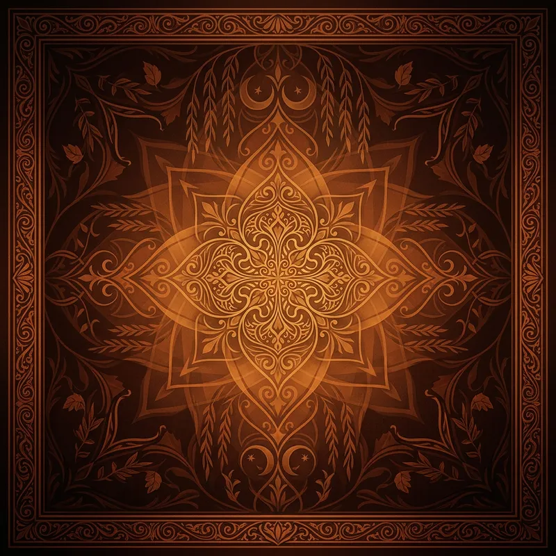 Design a traditional desktop background in night mode. Picture layers on layers of transparency, gradually changing from dark brown to various shades of orange. Envision it to reflect a melancholic mood. Use the principle of repetition and symmetry associated with traditional design for an aesthetically pleasing appeal.