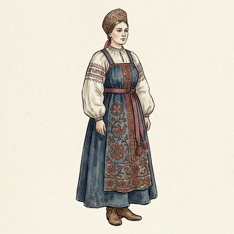 Detailed Illustration of Traditional Russian Dress in Ink & Watercolor